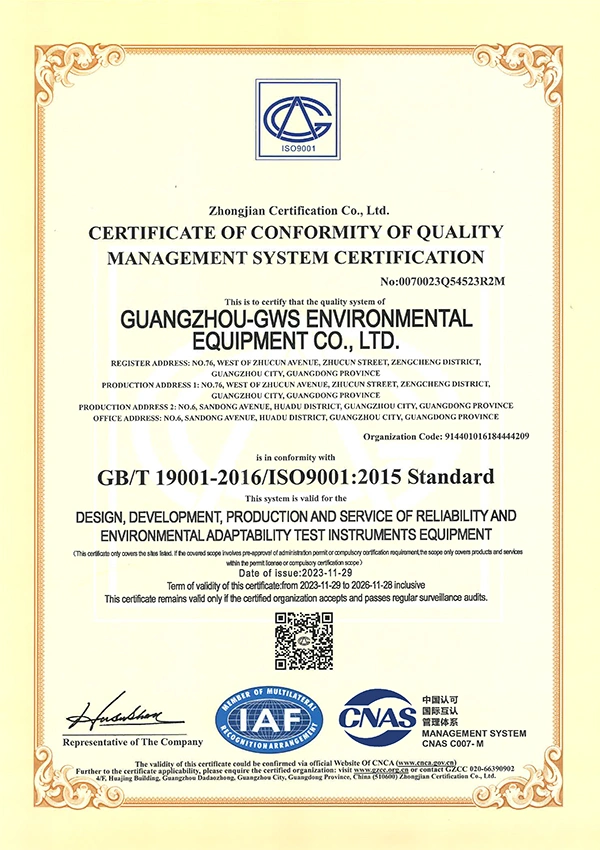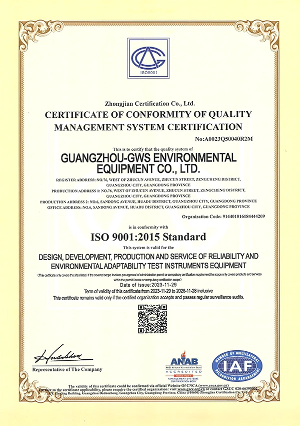 Incluso pequeñas variaciones en las condiciones ambientales pueden afectar significativamente a los componentes de precisión. En GWS, controlamos todo el proceso de producción, desde la selección de materias primas hasta el ensamblaje final, incluyendo diseño, fabricación y calibración de cada equipo antes de su entrega. Esta gestión integral nos permite ofrecer cámaras climáticas, sistemas de vibración y soluciones de prueba personalizadas con precisión y fiabilidad constantes. - ¿Cómo aseguran la uniformidad en sus sistemas y procesos de prueba?